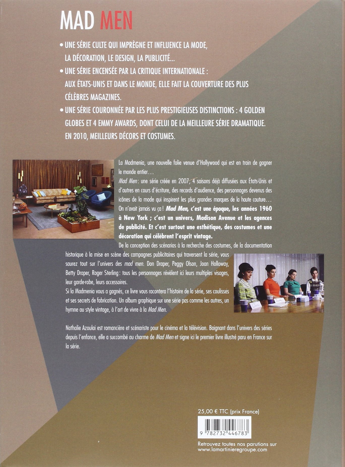 « Nathalie Azoulai dans un livre broché, Mad Men, Un art de vivre, décrypte comment de la conception des scénarios à la recherche des costumes, de la documentation historique à la mise en scène des campagnes publicitaires qui traversent la série, ces Mad Men nous ont entraînés dans leur monde. »